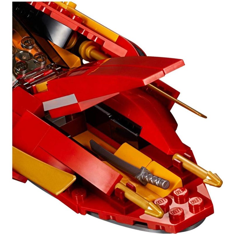 - Build Red Ninja Kai’s Katana V11, featuring speed and attack modes, foldout boosters, 2 hidden spring-loaded shooters, an opening storage compartment, gold-colored ninja blades, plus a motorbike!
