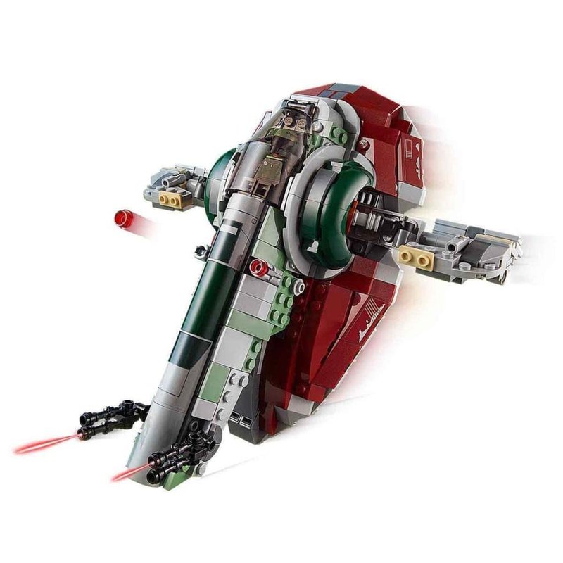 - Features a LEGO brick buildable model of Boba Fett’s Starship, with a handle for easy flying, rotating wings and 2 stud shooters