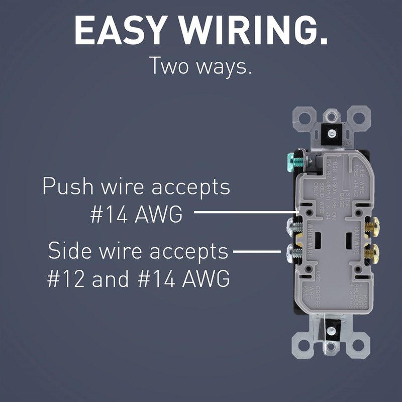 - Easy to Install - This wall outlet features side-access push wire release, side wire terminal screws 12-14 AWG solid wire, push wire terminals for 14 AWG solid copper wire only, longer tri-drive screws and quick loop wiring aid for easy 12 AWG looping