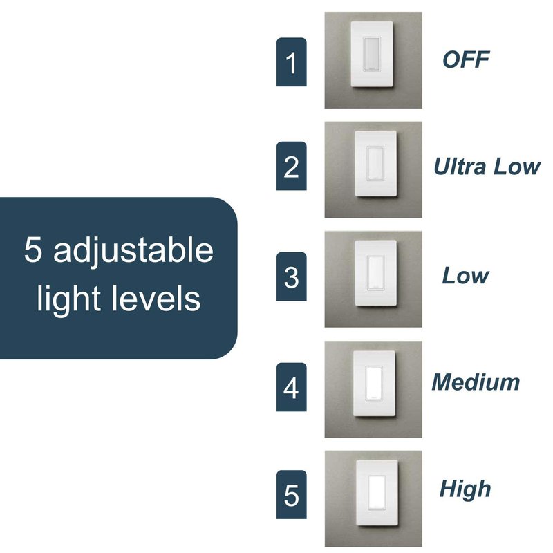 - Use - Easily replace any standard outlet with this in wall nightlight with five adjustable light levels, ultra low, low, medium, high and OFF and a hidden sensor that automatically turns on the night light based on ambient light levels