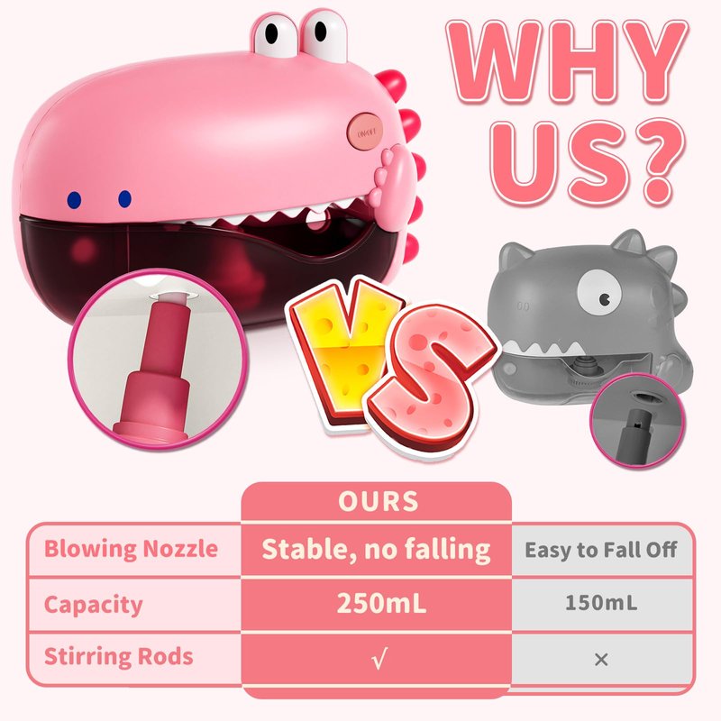 - Newly Upgraded Bubble Machine - Our baby bath toys now boasts a more stable silicone foamer connection that resists detachment. Plus, we’ve increased the capacity from the usual 150/200mL to an impressive 250mL, allowing for continuous bubble production. It’s the perfect distraction for kids who dislike washing their hair, filling the bathroom with fun and laughter!