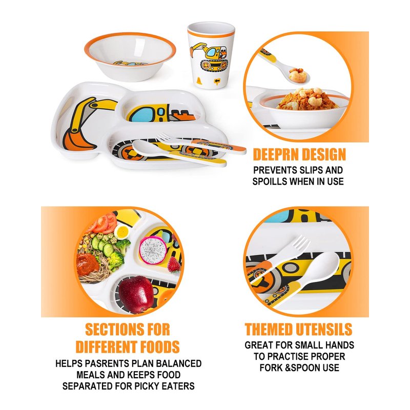 This brightly colored construction-themed dinnerware set combines practical child development with engaging entertainment that kids will love. It's a great way to inspire kids' imagination while encouraging mealtime independence and utensil skills. It also helps parents plan balanced meals with each area on the plate representing a food group. Plus the divided areas keeps food separated, which is helpful to picky eaters. The plate is equipped with a non-slip base to prevent spills and messes. And they go right into the dishwasher for easy cleanup. They are made of non-toxic BPA-free plastics. And they are stackable so they take up less space in the cupboard! The colorful five-piece set includes a plate, bowl, cup, spoon and fork. All pieces are crafted from food-safe and BPA-free high-quality materials for children aged three and older. The durable melamine plate and bowl stand up to regular use with ease and the lightweight polypropylene plastic cup is perfectly sized for kids’ hands. The fork and spoon feature sturdy stainless steel with easy-grip plastic handles.