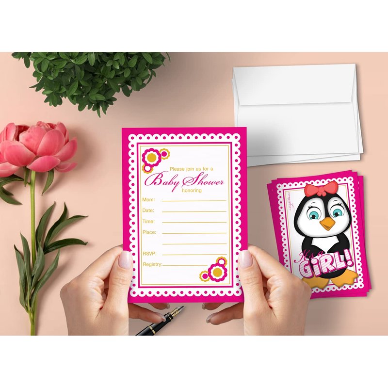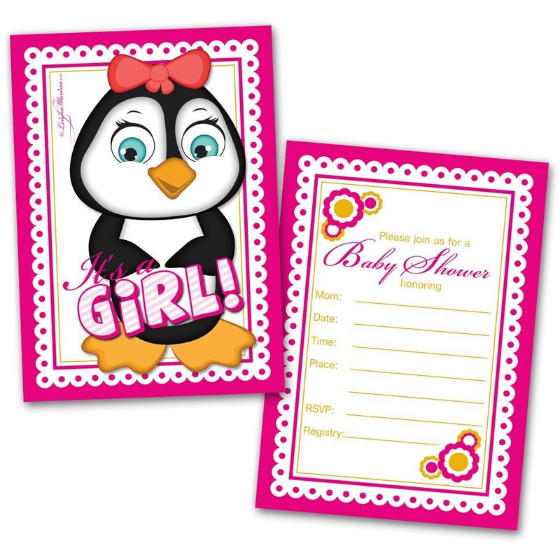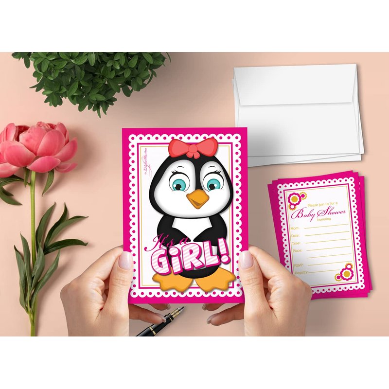 Leigha Marina It's a Girl Penguin Baby Shower Invitations – 20 Cards & 20 Envelopes