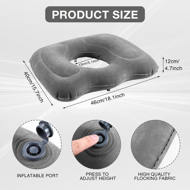 Features: This donut seat cushion makes a good gift for your family, partners, or colleagues who suffer from discomfort while sitting. It shows that you care about them. This seat cushion is easy to clean and maintain, and you can wipe it down with a damp cloth. The cushion is portable and lightweight, making it easy to carry around whenever you need it. It is ideal for outdoor activities such as camping, hiking, or picnics, or for use in the car, office, or home. Specifications: Material: flocked PVC Color: graySize: approx. 18.1 x 15.7 x 4.7 inches/ 46 x 40 x 12 cmPackage includes: 1 x Inflatable seat cushionNotes: Manual measurement: please allow slight errors in size. The color may have a slight difference due to different screen displays. Do not overinflate it to avoid bursting. The product does not include a pump, and please confirm the size when ordering.
