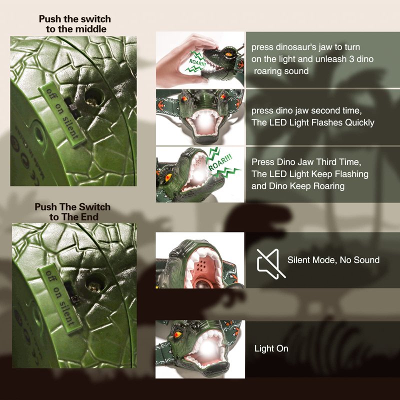 - [Tyrannosaurus Shapes & Roar with 4 Modes] The dinosaur Led headlamp is based on the shape of kids’favorite Tyrannosaurus with 4 modes and simulation roaring sound for kids' outdoor activities, including a silent mode for reading.