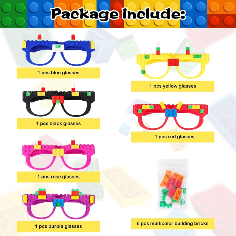 - Package Includes: You will get 6pcs glasses frame (red, yellow, blue, purple, pink and black), each glasses frame comes with a pack of colored building brick, kids can create their unique pair of glasses by building onto them.