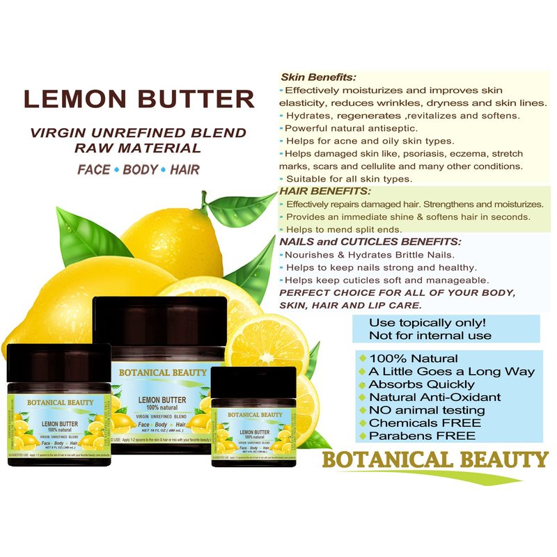 - One of the best raw butter to rejuvenate and regenerate skin tissues. LEMON OIL BUTTER is rich in beta carotene, vitamins A, B, C, D, E & F and pro-vitamin A. A Little Goes a Long Way, Absorbs Quickly, Not Greasy, Chemical Free, Not tested on Animals. DOES NOT CONTAIN ANY PRESERVATIVES.