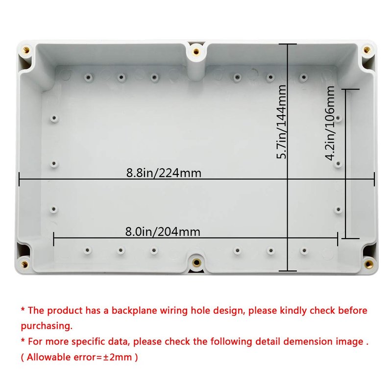 - Outside size of electrical enclosure (approx.): 9"x5.9"x3.4"(230mmx150mmx87mm)(L*W*H); Inner size of electrical enclosure (approx.): 8.8"x5.7"x3.2"(224mmx144mmx81mm)/(L*W*H)- - * Tips: in order to confirm the detailed installation dimensions, please refer to our detail image, which shows specific internal dimensions of the product.(Allowable Error: 2mm) ; Thickness: 0.16''/4mm; Screw Thread Dia.: 4mm/0.16"