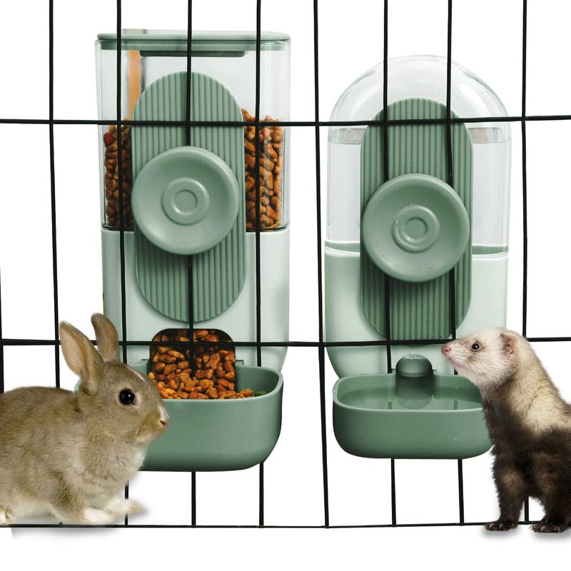 - [Hanging Design]: Hanging the rabbit food dispenser and rabbit water dispenser at a height ,to prevent neck discomfort caused by pets drinking water with their heads up or down. Buttons are designed to fit most small pet cages and fit inside and outside of the cage as needed.