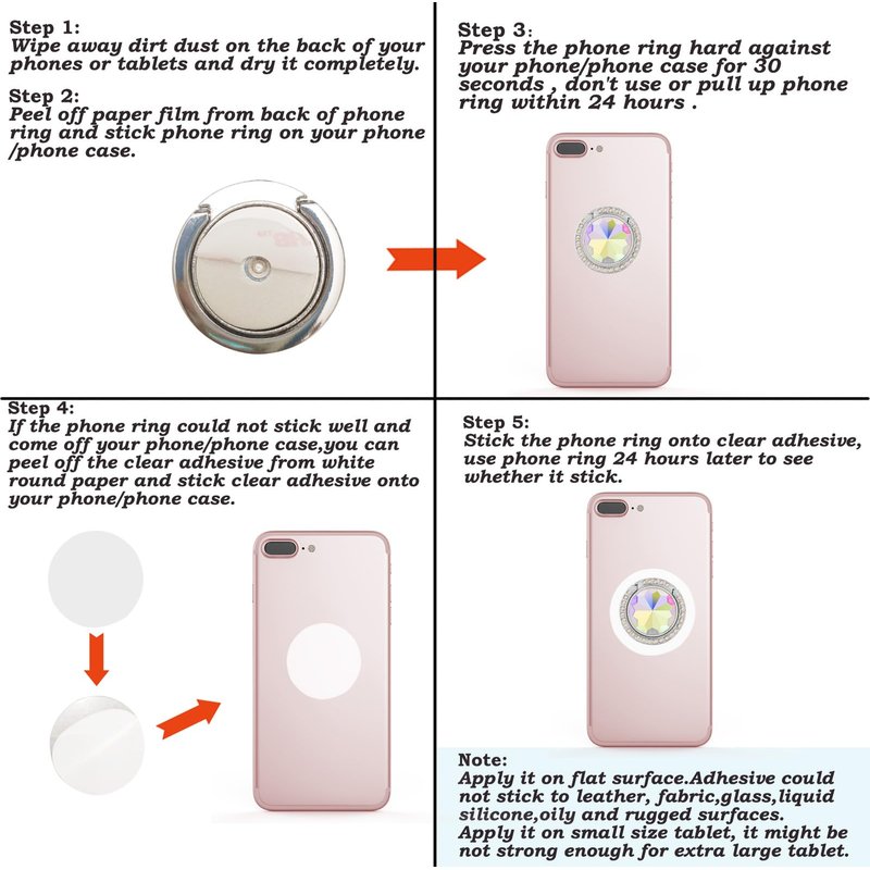 4. If the phone ring could not stick well and come off your phone/phone case,you can peel off the clear adhesive from white round paper and stick clear adhesive onto your phone/phone case,then stick the phone ring onto clear adhesive,use phone ring 24 hours later to see whether it stick.