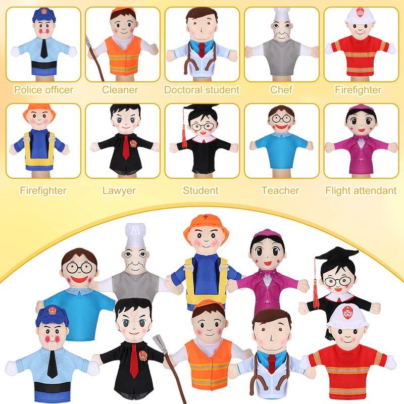 - Package Content: hand puppets set includes 10 hand puppets of different professions, police officer, cleaner, doctoral student, chef, firefighter, electrician, lawyer, student, teacher, flight attendant; Their occupational characteristics are obvious and easy to distinguish, using them for role play can engage your children and help them get to know different careers