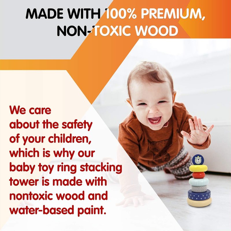 - β€ β ππππ ππππ πππ% πππππππ, πππ-πππππ ππππ: We care about the safety of your children, which is why our baby toy ring stacking tower is made with non toxic wood and water-based paint. The paint will not come off into your childβs mouth or risk contamination.