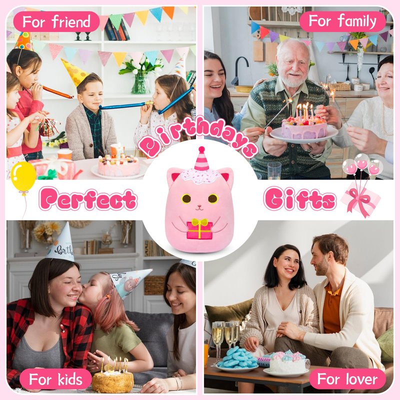 - Birthday Plish Gifts for Kids : This pink cat plush pillow is perfect as a birthday gifts for kids. Happy Birthday Plush is very suitable for birthday party scenes, adding a happy atmosphere to birthday parties. This pink birthday cat plushies can decorate birthday parties, rooms, and can also be given to dear family, children, friend. The cute birthday cat plush is loved by the elderly and children
