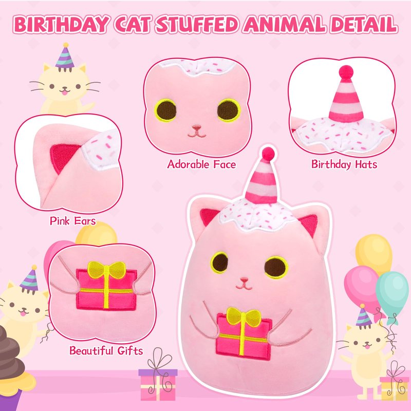 - Birthday Cat Plush : This pink cat plush toy is designed to be cute, with a gifts pattern embroidered on the belly and a birthday hat on the top of the head. These cute elements combined add a cute charm to the birthday stuffed animal
