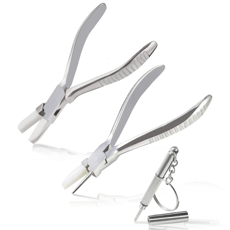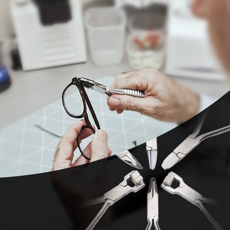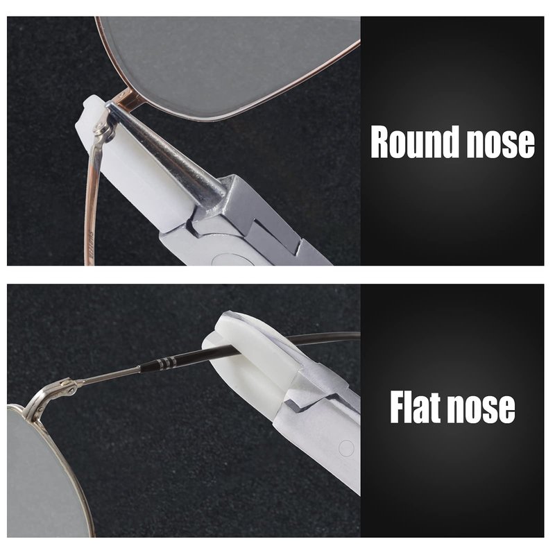 - Practical: The round nose plier perfect for adjusting and repairing eyeglasses frame. The flat nose plier perfect for adjusting and repairing eyeglasses arms frame, eyeglasses legs, removing spectacle lens. The nylon jaws are non-slip and will not damage your glasses. Easy to operate for professional or individuals use.