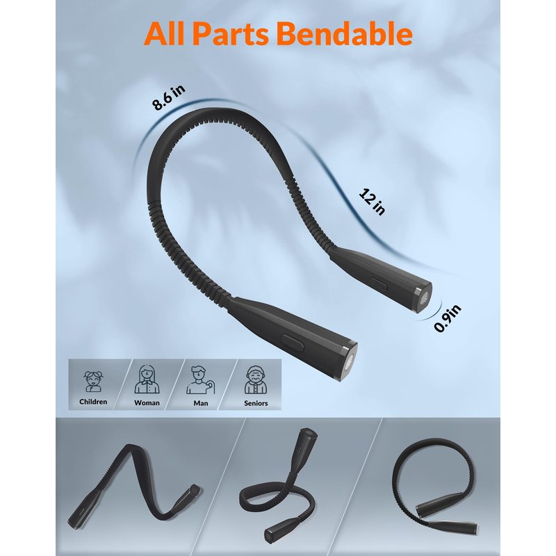 Comfy to Wear reading neck light, entirely made of skin-friendly silicone, gently touches the neck, enhancing the wearing experience. Whether sitting or lying down, the 13mm neck rest of the neck light remains pressure-free. Flexibly Cuddles Any Neck The neck rest of the book light is made of ultra-soft silicone. In addition to its enjoyable texture, it allows the neck light to be bent and curved exclusively for any family member. Eye-caring and Private Light The reading light provides up to 100lm focused light with an even distribution, containing 0 harmful blue light. The narrow beam angle ensures privacy and does not disturb any others around. 15 Lighting Options With 5 brightness levels and 3 color temperatures, this book light is a must-have for daily tasks. Whether for reading, sewing, crafting, or other tasks, the neck light offers hands-free lighting and more convenience. Ease of Use The neck light contains a 1300mAh rechargeable battery and easily shines all day. The enlarged buttons on both ends of the neck book light make it easy to operate under any conditions.