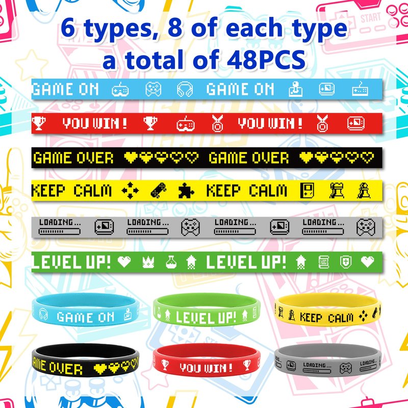 - 【Reliable Material】These video game party wristband are mainly made of quality silicone materials.It’s a water proof,eco-friendly and non toxic product,the colors and words are clearly printed that not easy to fade,soft to touch,which are stretchable,flexible,not easy to break,can serve you for a long time,bring you a comfortable wearing experience.