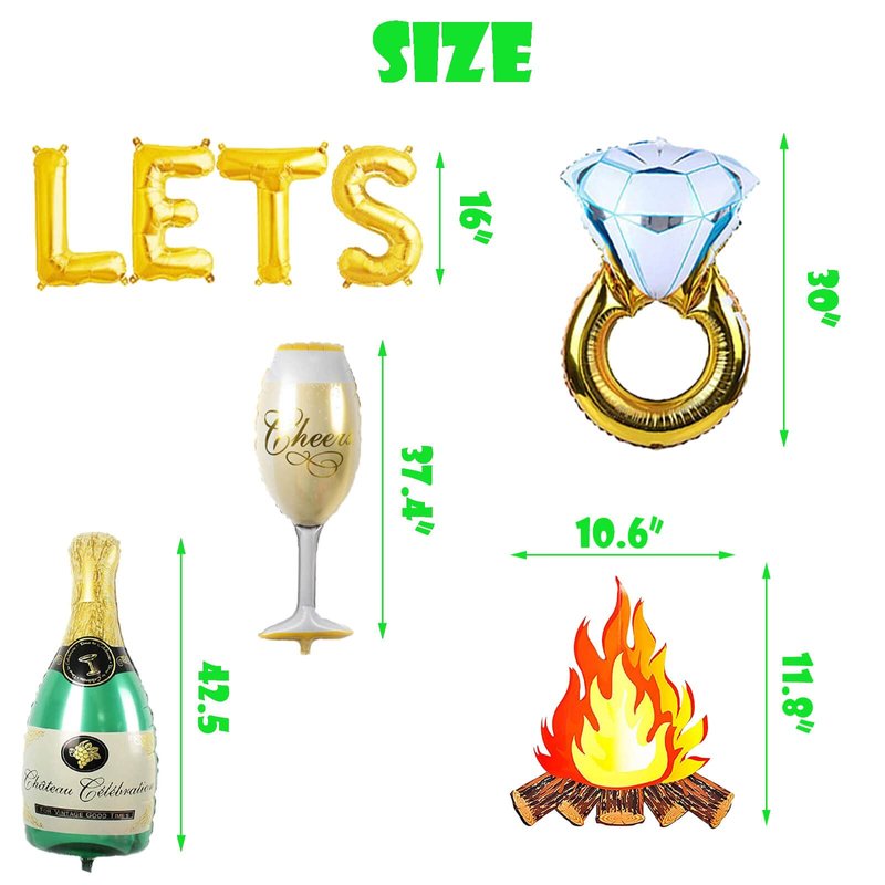 - SIZE: Each letter balloons Size: 16", Champagne Bottle Balloon Size: 42.5" x 19.7", Winebowl Balloon Size: 37.4" x 11.8",Ring Balloon Size: 27"x24", 3D-Design Campfire Banner Size: 11.8" x 10.6", Gold Metallic Fringe Curtains Size: 3.28X6.56ft, Latex Balloons: 10".
