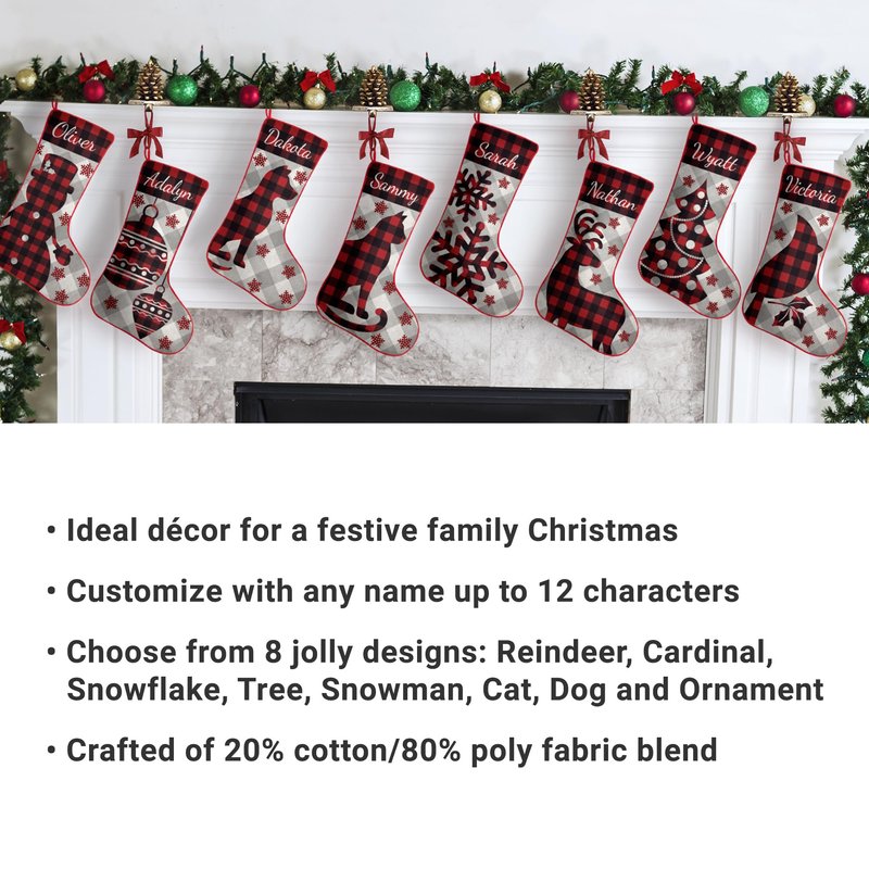 - UNIQUELY PERSONALIZED: Ready to be hung by the chimney with care! Choose Cardinal, Christmas Tree, Reindeer, Snowflakes, Dog, Snowman, Ornament or Cat design. Customize this festive stocking with any name up to 10 characters.