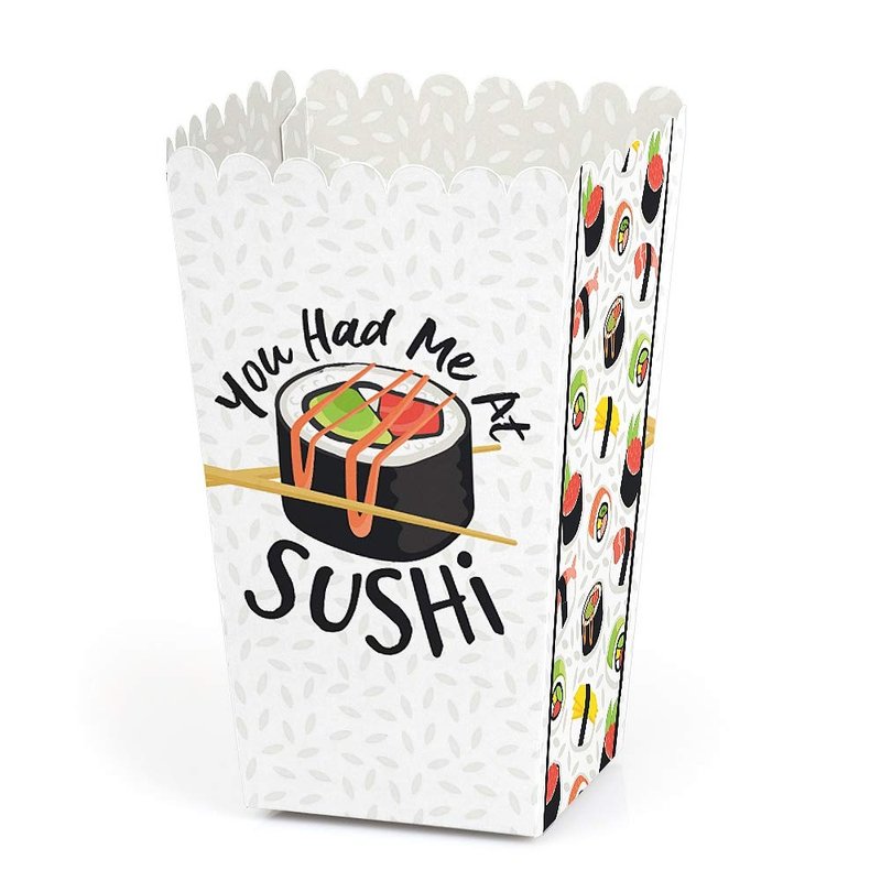 - Let’s Roll - Sushi favor popcorn treat boxes SIZE 5.75 inches tall x 3.5 inches square at the top. The unique design and large size makes these 12 sushi popcorn boxes a must-have for any a Japanese baby shower or birthday party.