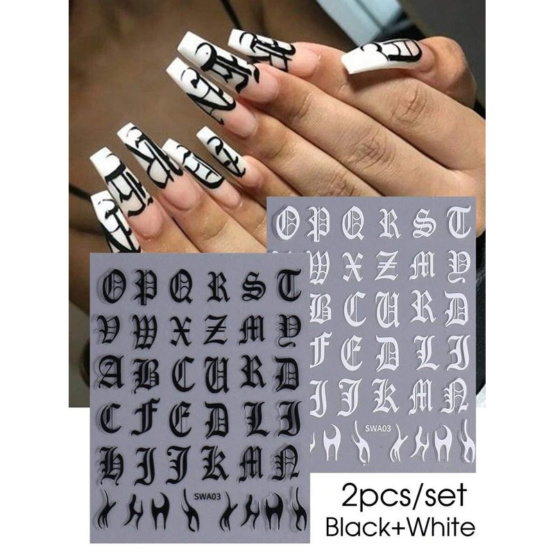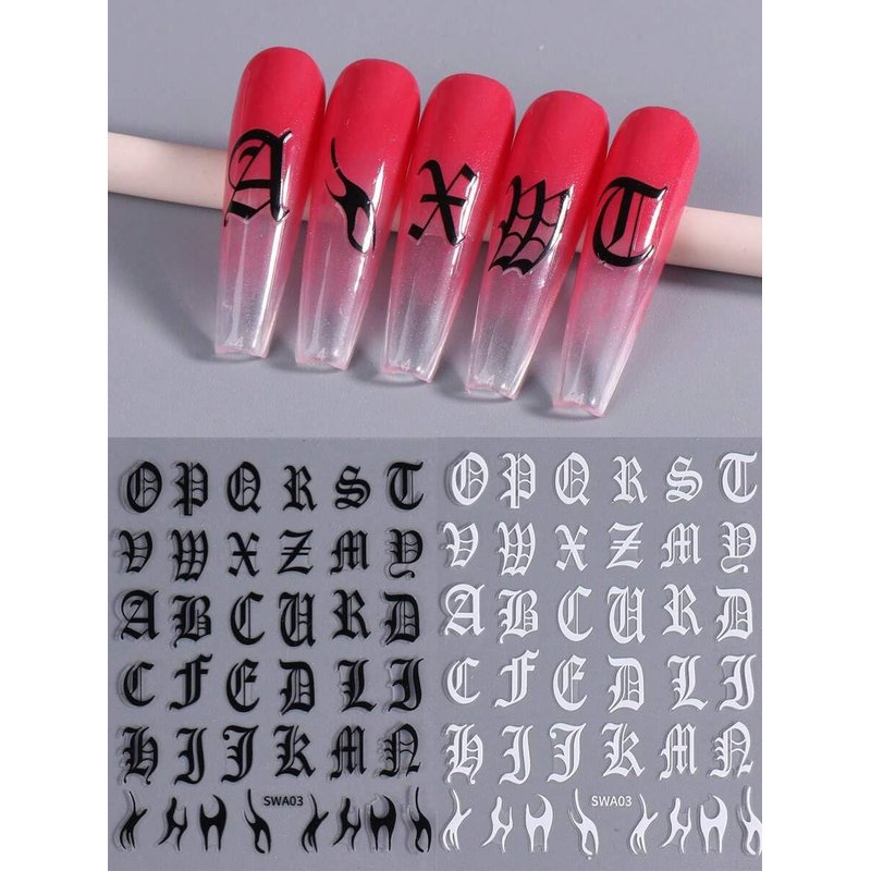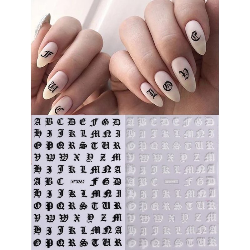 Letter Nail Art Stickers Black White Alphabet Old English Character Stickers Self-Adhesive DIY Nail Decals Retro Gothic Nail Stickers for Nail Art Big Letter Nail Art Design Cute Nail Decals 4PCS