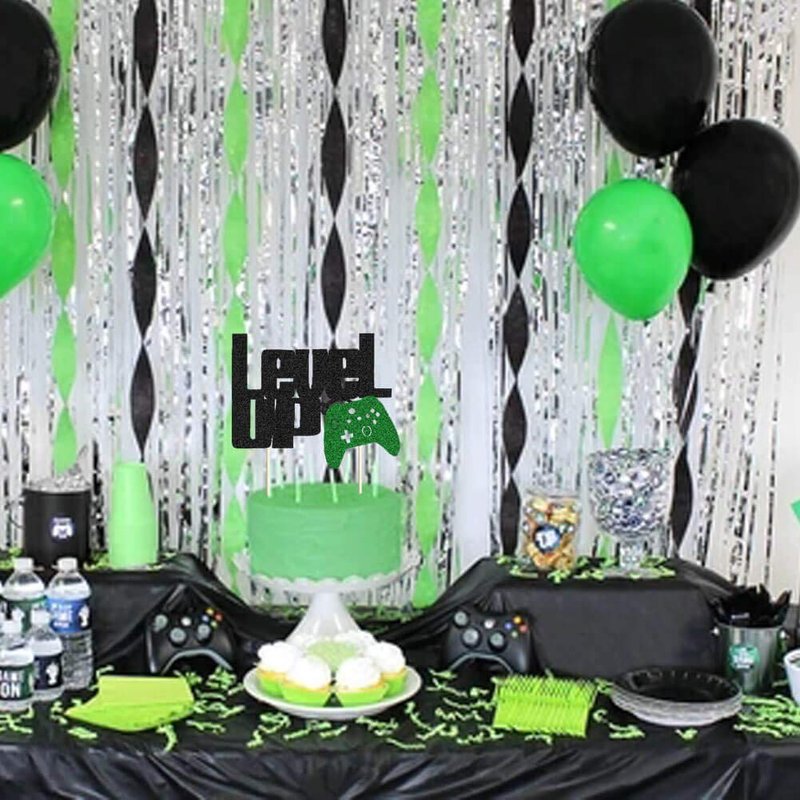 Level Up Cake Topper Black and Green Glittery Video Game Party Cake Decor Video Game Controller/Game Fans/Gamer/Gaming Themed Kids Boys Happy Birthday Party Cake Supplies Decorations