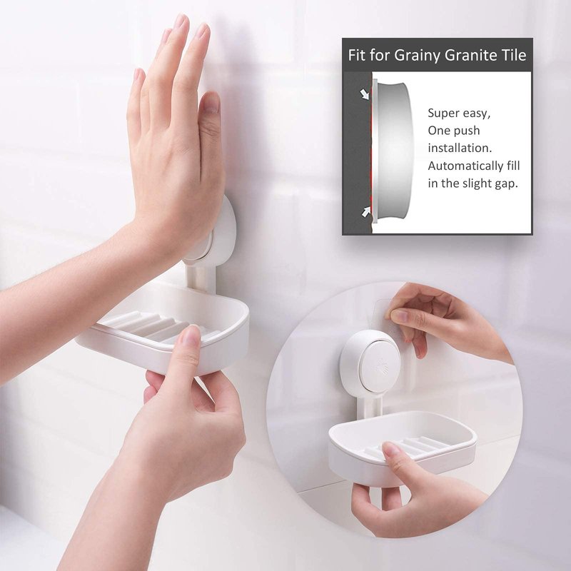 Soap Dish Suction Cup Bathroom Soap Holder Suction Cup Wall Mounted Powerful Heavy Duty Max Hold 11lbs Soap Holder Shower NO-Drilling Waterproof Sponge Holder for Bathroom Kitchen – White PATENTED PRODUCT - Super Durable Powerful ONE SECOND INSTALLATION No tools applied. Just use your palm to push the suction cup, then finishing the installation! Water Resistance Oil Resistance Waterproof Oil-proof design makes the soap dish suction cup can be used in wet such as bathrooms and kitchens. REUSABLE Simply use the credit card to remove the hook from the wall, and then just wash the suction cup with warm water and air dry it for re-install. DAMAGE-FREE No drilling, no screws, no holes, no glue to apply the vacuum suction cup. Instructions for Installation: 1. Clean and dry the installation area. 2. Peel off the protective film on the hook. Please, take it off carefully! 3. Press the hook on the "PUSH" logo with your palm until see an obvious distance change between the suction pad and the applying surface or hearing a weak sound of "puff". And check the hook by pulling the hook down. If the hook cannot be moved by hand which means the installation is right or you need to press it with more strength. How to remove: 1. Please use a credit card to remove and wash it with warm water before re-installation. 2. To prevent hurting your hand, do not remove it directly, because the suction power is very strong. SUITABLE WALL This powerful soap dish for shower works best for non-porous, impervious, smooth surfaces such as glass, mirror, polished metal, stainless steel, plastic board, wall tile, grainy granite even with a little bit of dimpling, etc. Please remind that don't stick to a grout line and on the porous surfaces such as: wood, unfinished marble, porcelain, wallpaper, natural stones (such as Travertines), painted wall.