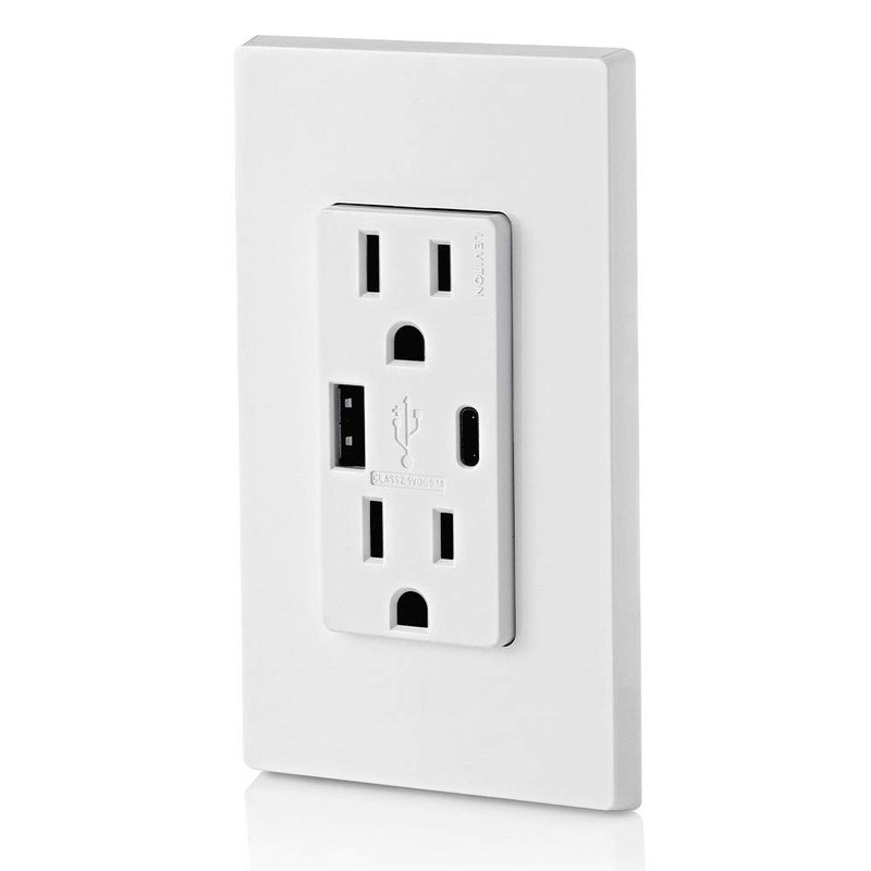 Leviton T5633-W Type A & Type-C USB In-Wall Charger with 15A Outlet, USB Charger for Smartphones and Tablets, White