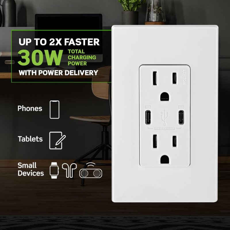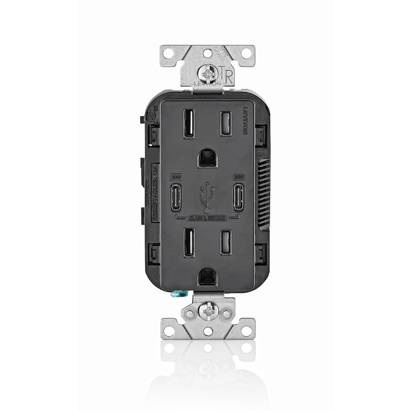 Leviton T5635-E 30W USB Dual Type-C Power Delivery In-Wall Charger with 15A Outlet, USB Charger for Smartphones, Tablets, Black