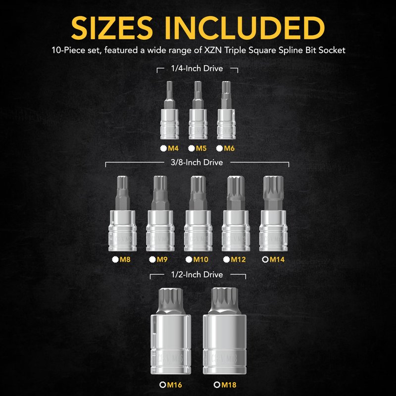 - MUST HAVE - 10-Piece set XZN Triple Square Spline Bit Socket. Crafted and Designed to work on European automotive like: BMW, Mercedes, VW, Audi, Porsche, and most other European vehicles.