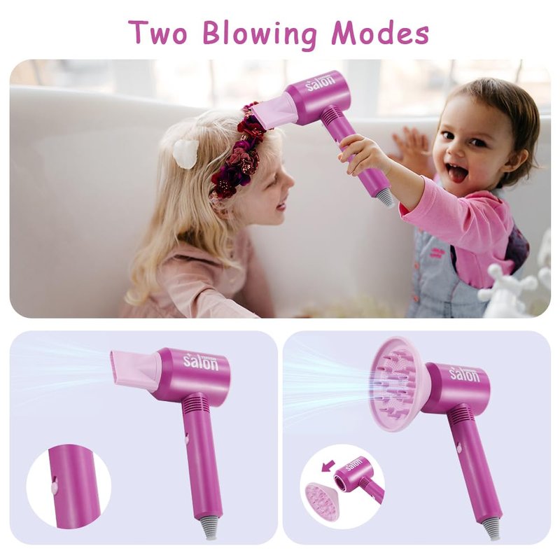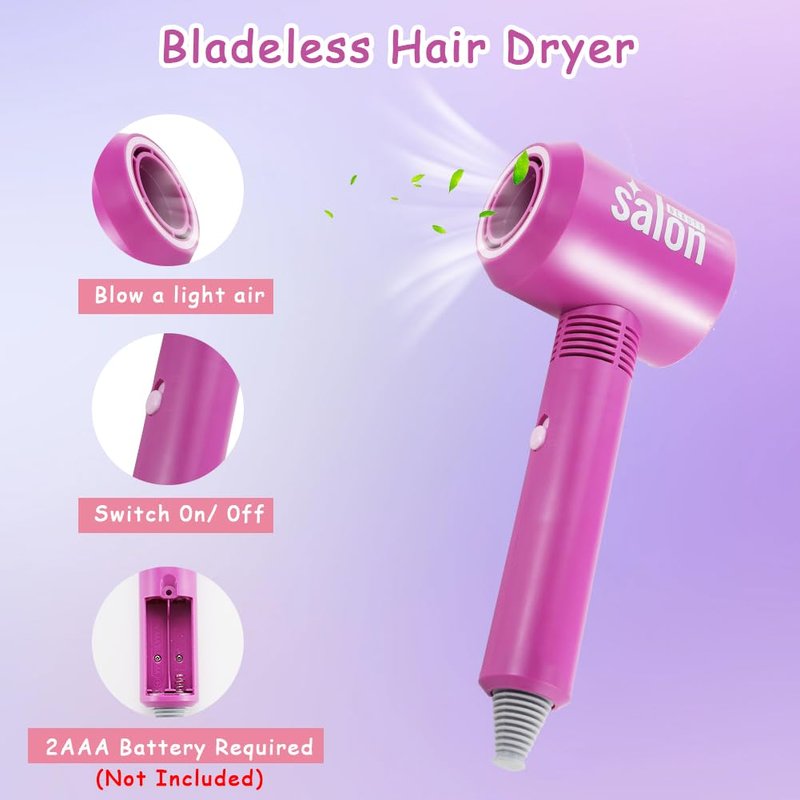 - Realistic Hair Salon Playset:This play hair salon set for girls simulates a real scene. Battery operated blow dryer can make noise and blow air just like a real dryer. ( Note: 2 AAA batteries are required. Not Included). The pretend hair styling set is made of premium ABS plastic, safe and lightweight. Your kids can easily hold and use this Hair Stylist Toy.