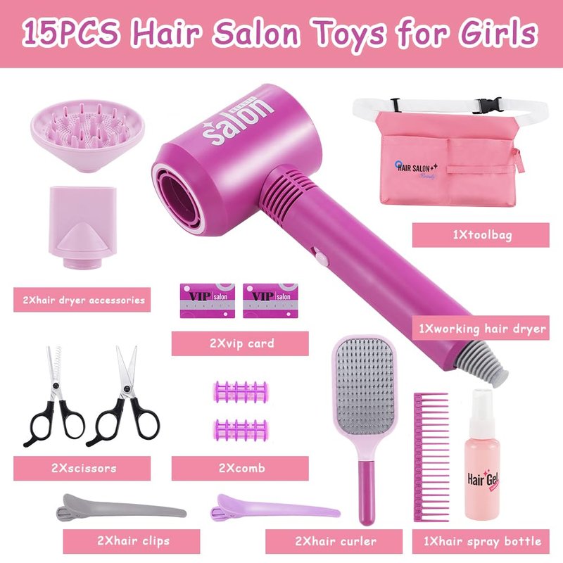 - Girls Hair Salon Kits: Our Lflwacy beauty hair stylist set includes all the 15 tools you need at a barber shop. You will get: realistic hair dryer, 2Xscissors,2Xvip card, 1Xhair spray bottle, 1Xtoolbag,2Xhair curler, 2Xhair clips, 2Xcomb, Everything is placed in a beautiful gift box for easy storage.