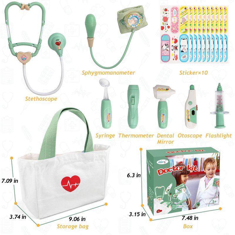 - ALL IN PACKAGE: Liberry doctor bag for kids includes stethoscope, thermometer, syringe, dental mirror, otoscope, sphygmomanometer, medical bag, flashlight and bandage stickers. The bag can store all the medical tools which is very convenient for you to carry