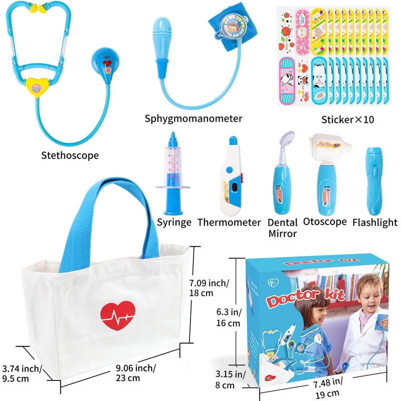 Stethoscope, Thermometer, Syringe, Dental Mirror, Otoscope, Sphygmomanometer, Flashlight, Bandage Sticker×10, Doctor Bag for Kids.