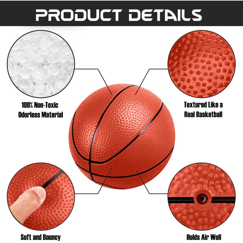 Set of 4 spare basketballs for Mini Shot indoor basketball hoop seta (sold separately)--and--also offers a fun, small-yet-realistic mini basketball for young kids. The ball provides the look and feel of a real basketball in a smaller more manageable size. Great for the home, office, or dorm. Use these basketballs as additional balls for your Indoor hoops set! Made of Safe 100% Non-Toxic TPU Rubber