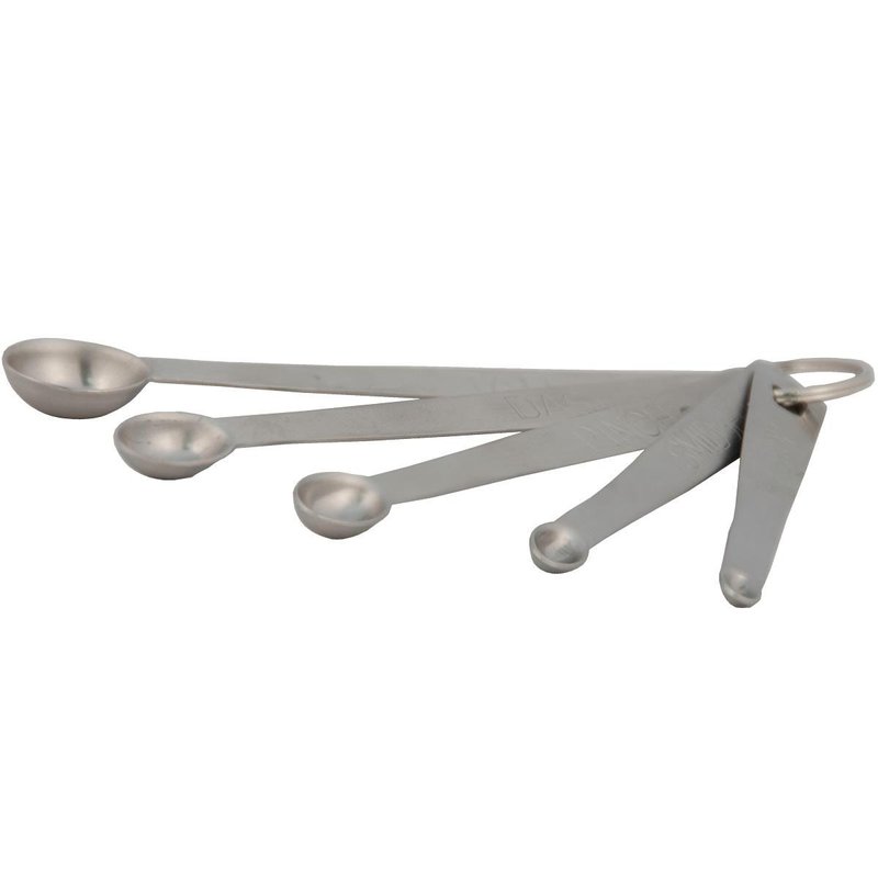 Set of five unique measuring spoons Contained on a no-slip ring Made of durable stainless steel Makes a one-of-a-kind gift Dishwasher Safe