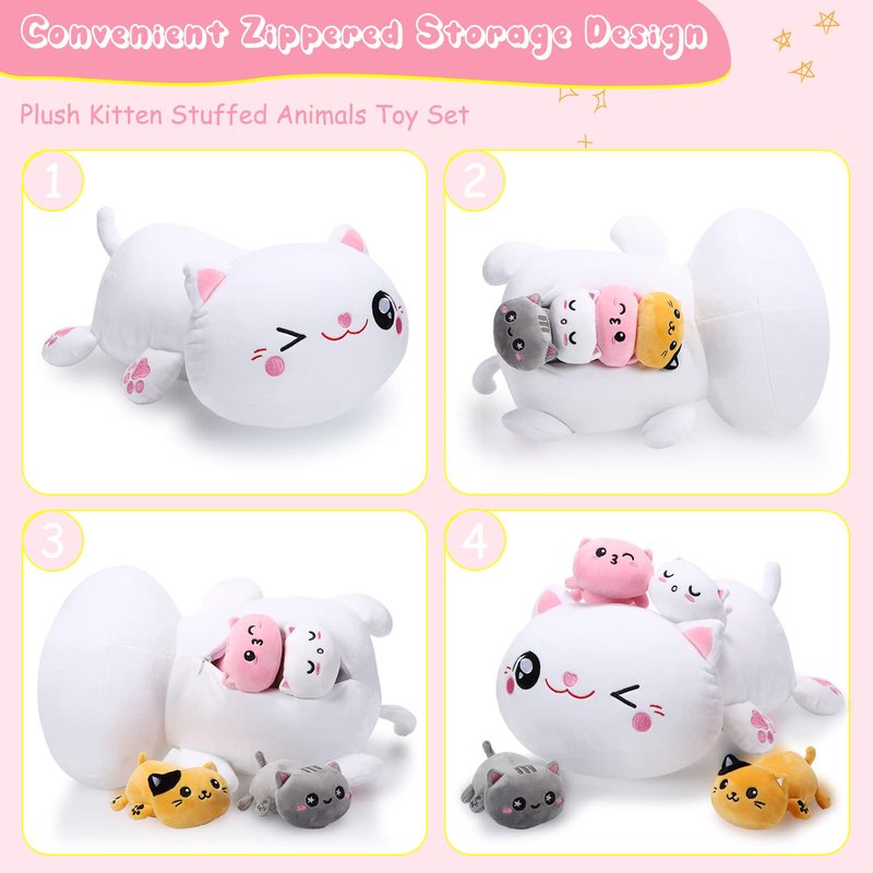 - Ideal Partner: the mommy cat's belly features with a zipper design, which can open, and help her give birth to 4 kittens for the fun of hatching and parenting, bring endless fun, helps to develop social skills and imagination; The cat plush also can be regarded as sleep and play companions