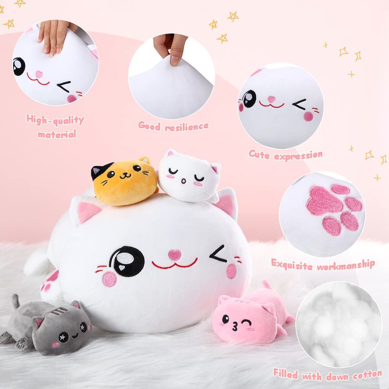 - Soft and Comfortable: the stuffed cat with kittens adopts elastic and soft fabric, filled with down cotton, reliable and safe, friendly to your skin, soft and fadeless, cuddle and snuggle comfortably, which will accompany you for a long time