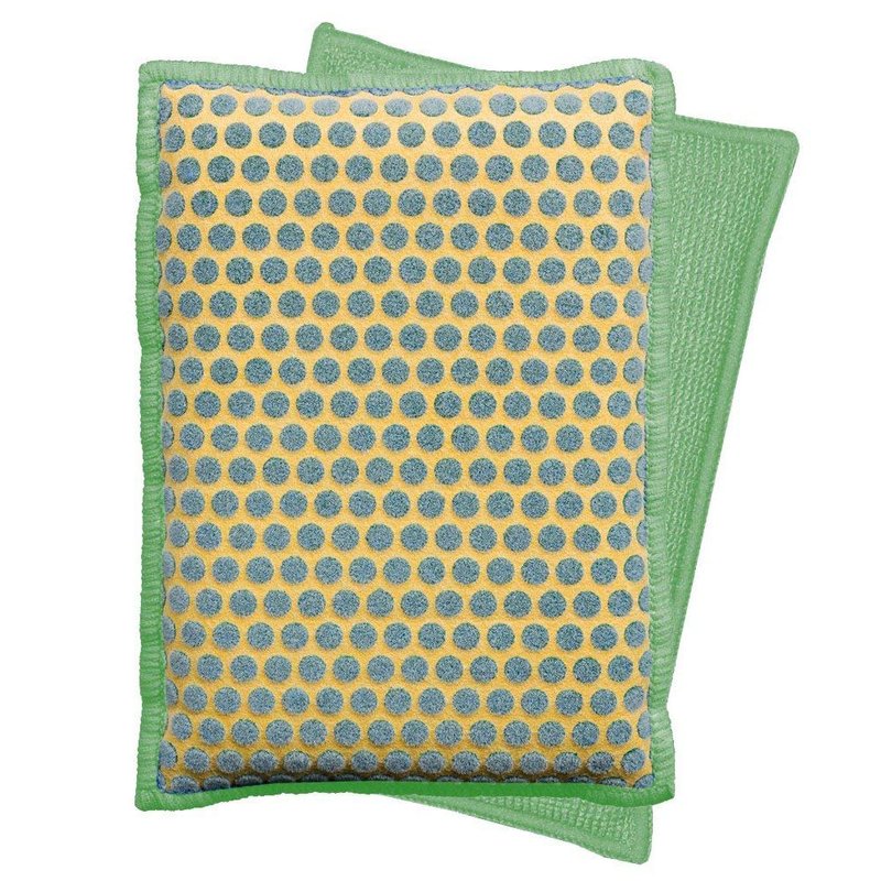 - One side with scrubbing dots and another with a microfiber surface