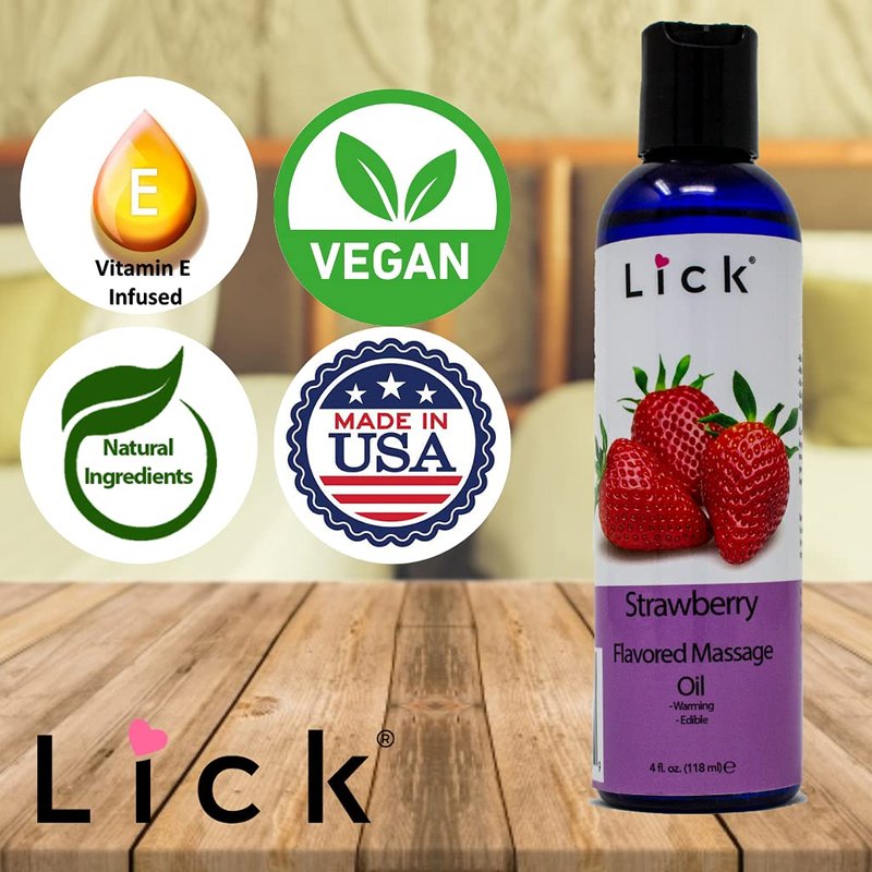 Lick Strawberry Flavored Massage Oil with Natural Vitamin E, Almond, Coconut Ideal for Aromatherapy, Moisturizing, Relaxing Muscle Massage. Essential Non-Sticky Skin Therapy for Men & Women - 4 oz