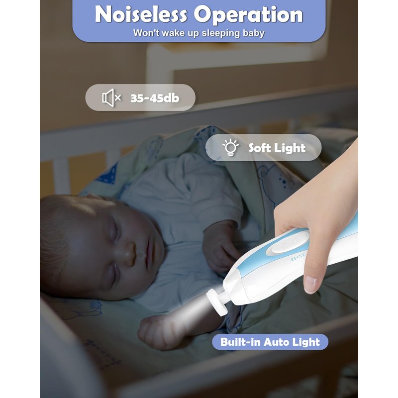- Ultra-Quiet & Smart LED Light - Lictin baby nail trimmer is equipped with a silent motor (35-45 dB), providing a peaceful nail trimming experience that won't disrupt your baby. The built-in LED light, specifically designed for fingernails, enables you to trim your baby's nails with precision, even while they are sleeping, ensuring a hassle-free experience for both you and your little one