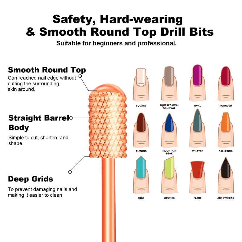 - Cross Teeth Design - With a cross-cut design, safety and quick for smooth shape contour nail gel surface or natural nail. The drill bits are smooth rounded at the top with straight barrels to protect the cuticles and side walls from scratches and cuts upon contact.