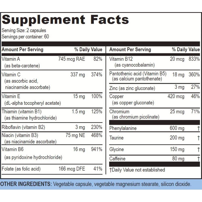 - CONTENTS - This formula contains the following ingredients: Vitamin B5, Vitamin A, Zinc, Vitamin C, Copper, Chromium, Fructose, Thiamin, Phenylalanine, Black tea, Riboflavin, Niacin, Vitamin B6, Taurine, Glycine, Caffeine, Vitamin B12.