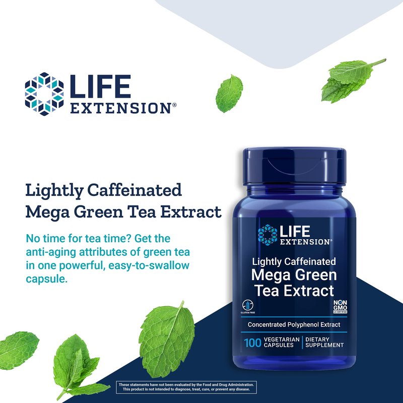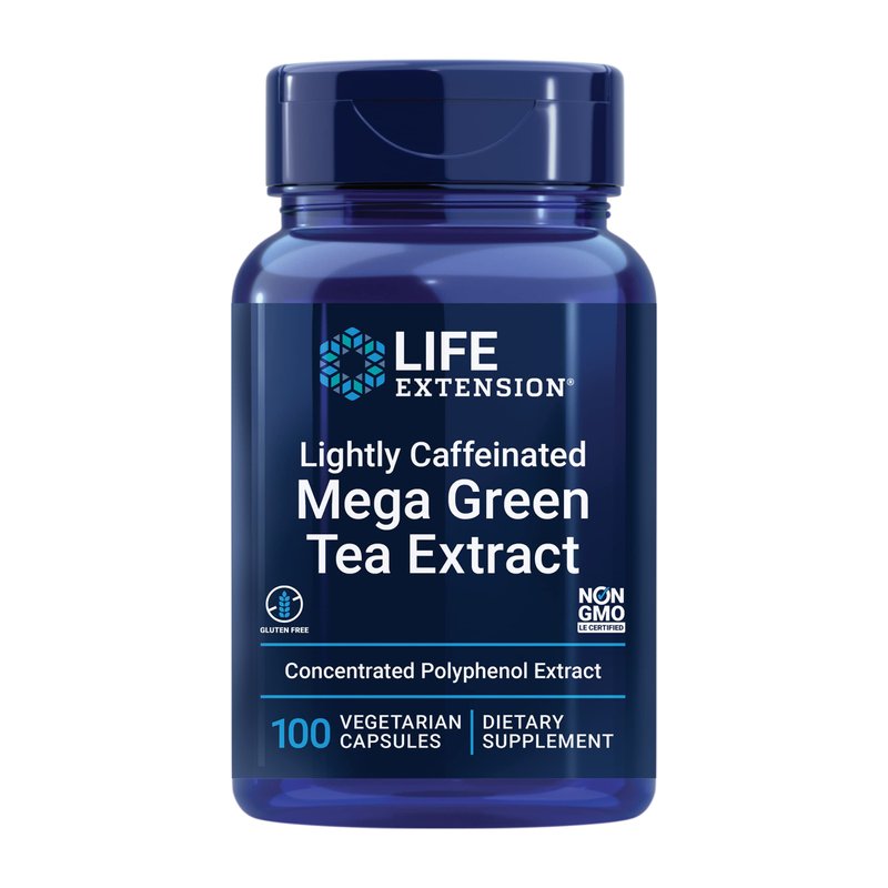 Life Extension Lightly Caffeinated Mega Green Tea Extract - 98% EGCG Polyphenols Supplement for Heart and Brain Health Support for Men and Women - Gluten Free, Non-GMO, Vegetarian - 100 Count
