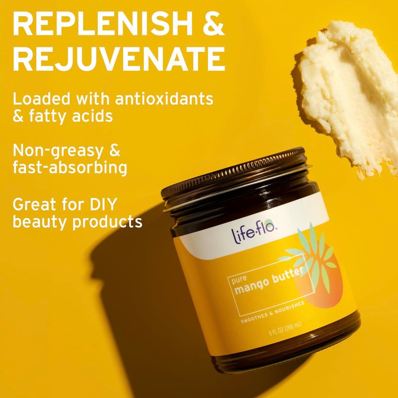 Life-flo Pure Mango Butter, Soothing Moisturizer for Dry Skin Care, Smooths and Nourishes, Doubles as Lip Balm, Nail / Cuticle Cream, Hand and Body Lotion, 60-Day Guarantee, Not Tested on Animals, 9oz