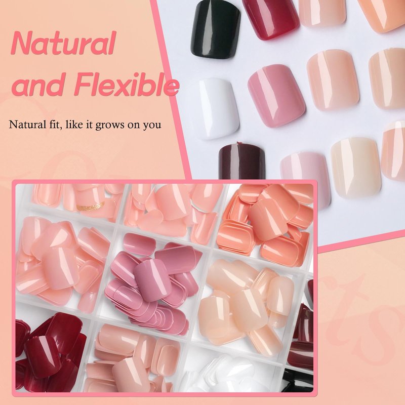 - Glue on Nails Short Length: Square nails press on will not affect your normal life, which is the best choice for office lady and people who have to do typing or writing. Square nails press on big nail beds may look shorts, on small nail beds looks long. Please check nails tips size into get detail size measurements, and choose ideal nail set, or our nail tips can be reshape by cut and file the nails to get your ideal length and shape, perfect for nail lovers to DIY!