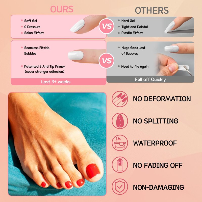 - 💅🎉High quality toe nails press on : This acrylic toenail kit made of high quality ABS material, strong and durable, lasts for days without any lifting or shifting. Engineered to conform to the natural curve of your toes, our glue on toe nails for women provide a comfortable and natural fit, allowing you to wear them for long time without discomfort. And if you want, you can sealing the nails by applying top coat and cure it with UV lamp to make the surface shine for long time.