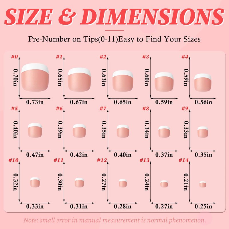3 in 1 gel nail tip press on nail no need base coat, no need to file, is ready to apply, save your time and money to salon. Also you can DIY the X coat gel nail tip, show your creativily and stylish! How to use: Step1: Choose the nail tips fit your nail. Step2: Clean your normal nails. Step3: Stick nail tips on with jelly glue sticker or glue. Step4: Use builder gel and top coat protect the top edge of the nail. How to remove: Step1: Use a wooden stick with professional nail remover to gently cock the nail or soak in warm water for 2 minutes. Step2: Removing jelly glue from normal nails and nail tips. Toe press on nails quantity: 240pc Acrylic Nails Press on toenails. Fake Nails Sizes: 125 sizes toe nails press ons. Press on nails short color: French tip nails. Press on nails short material type: Acrylic nails toe nail tips. Glue on nails style name: Press on toenails for women. Acrylic press on nails kit: Including fake nails with adhesive tabs. uñas postizas form: Plastic toe press on nails. Fake toe nails target audience: square press on nails for kids, stick on nails for women, girls press on nails, fake toenails for teens. Toe nail press on nails square shape usages: French tip press on toe nails press ons with gel nail glue and nail sticky tabs, and then design false nails with nail decorations and nail charms for nail art. Flawless acrylic toenails short: French tip press on nails without any trace, short nail nail tips not affect daily life. Easy application toe press on nails French tip: Short press on nails are suitable for beginners. Acrylic square nails multiple use: False nail press ons perfect for any occasion. Cute press on nails professional results: Press on nails short square shape easily get salon perfect press on nails. Glue on nails short length show your natural press on nails, different nails press ons short length look. Comfortable fit white press on nails: Our French nails fit your toenails comfortable and natural. Press on nails kit with Endless Possible: With fake nails for kids mix and match with nail charms for different nail art design. Presson on nails seamless blending: If you prefer natural short square nails, this best press on nails seamlessly blend with your natural nail bed. Strong acrylic nails press on: Short nails press on are incredibly strong and resilient, fake nails short length offering long-lasting press on nails and wear without sacrificing style. Perfect foundation with square shape press on nails: short length press on nails can provide the perfect foundation for your handmade press on nails. Enhance toenails with artificial nails: With short glue on nails, say bye to weak, brittle nails.