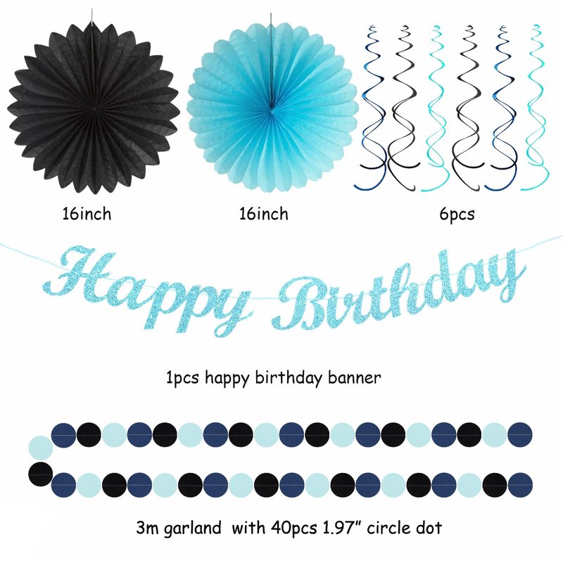 - 【Light royal navy dusty blue black Birthday kits】This kits include 1pcs happy birthday banner, 1pcs circle dots paper banner, 4pcs tissue pom poms: 3pcs 10" and 1pcs 12" , 3pcs 8inch paper honeycom ball, 2pcs 8inch paper lantern, 4pcs 12inch paper flower fan, 6pcs Paper swirls hanging streamers.