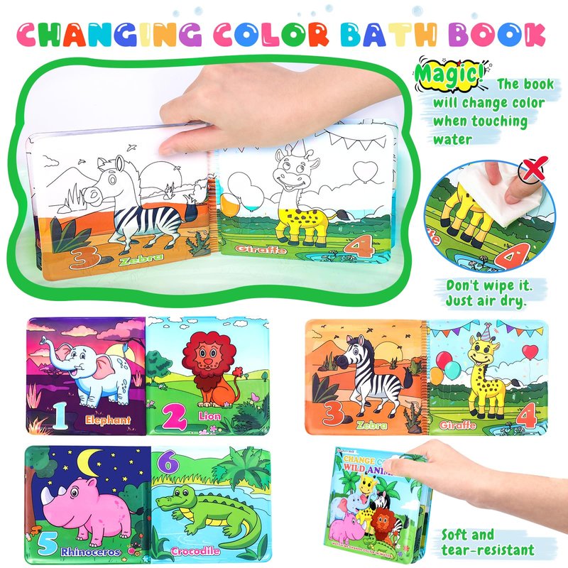- Color-changing Bath Book & Storage Bag -- The unique wild animals theme bath book will change color when exposed to water, just like a little magic to surprise kids. The bath book shows 6 different animals, with rich colors and image designs to stimulate children's sensory development. In addition, it comes with a mesh bag for these kids bath lights toys for tub, which is convenient for storage and air drying. Super fun bath toys for 1 - 8 year old kids baby toddlers boys girls